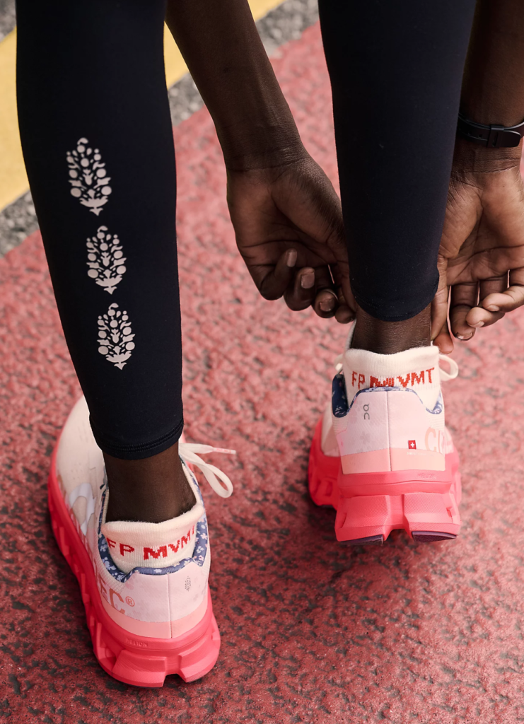Behold the limited-edition, two-style sneaker collection—Cloudmonster and Cloudnova Form 2, reimagined with an FP Movement twist. Each sneaker is a canvas of innovation, with an exclusive floral-printed insole, neon pops of FP Movement’s signature red, and the fusion of both brands’ logos—a visual symphony of wellness and style.